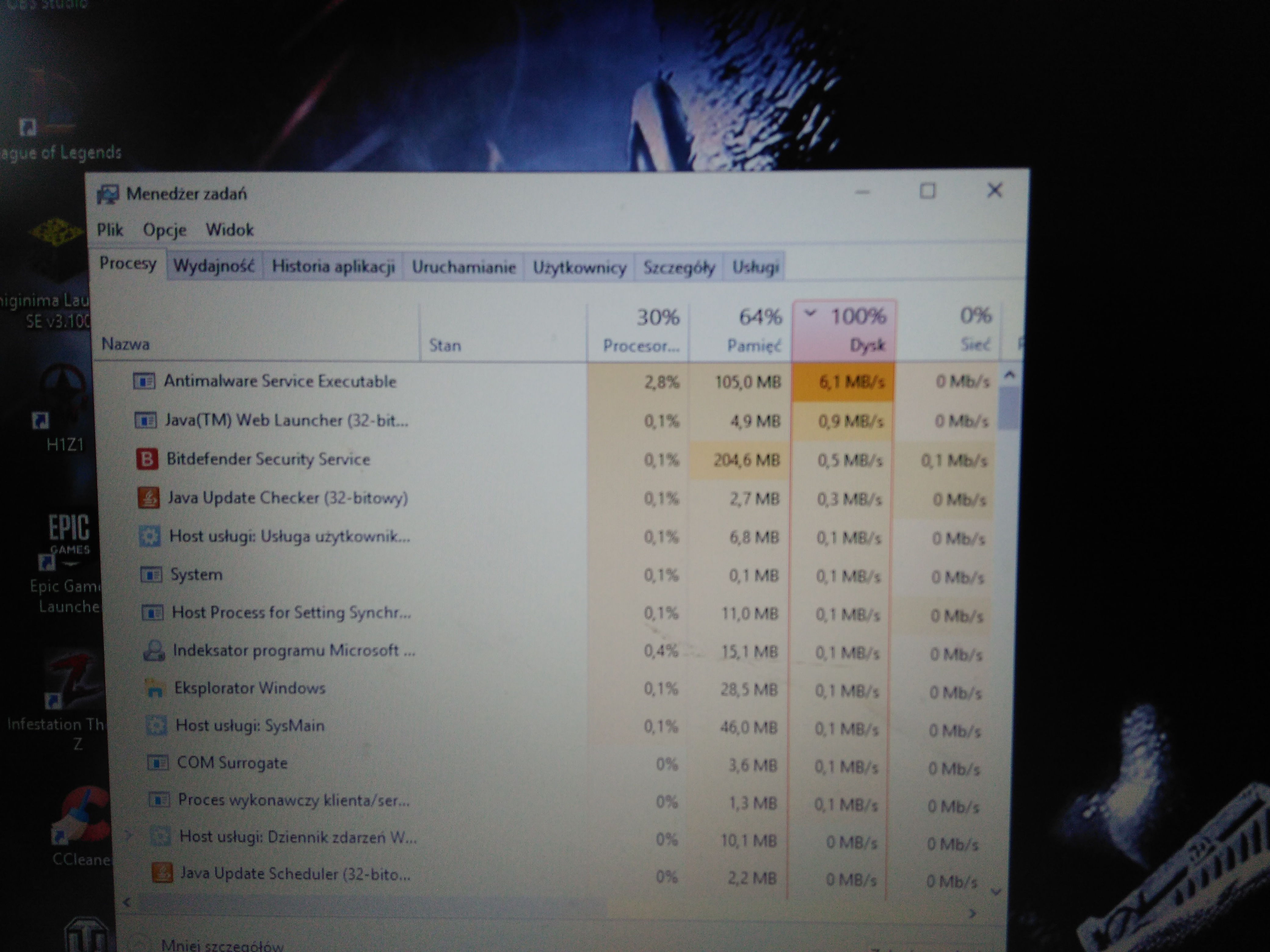 po kilku min spada do 10% i tak skaczę proszę o pomocMasz dwa antywirusy po prostu. Masz BitDefendera, który nie jest kompatybilny do końca z nowym Windowsem i Windows Defendera, który z tego powodu się włączył, bo BitDefendera “nie widzi”. Wywal BitDefendera i powinno być spoko, wtedy zostanie tylko Windows Defender. Ew. zaktualizuj BitDefendera.