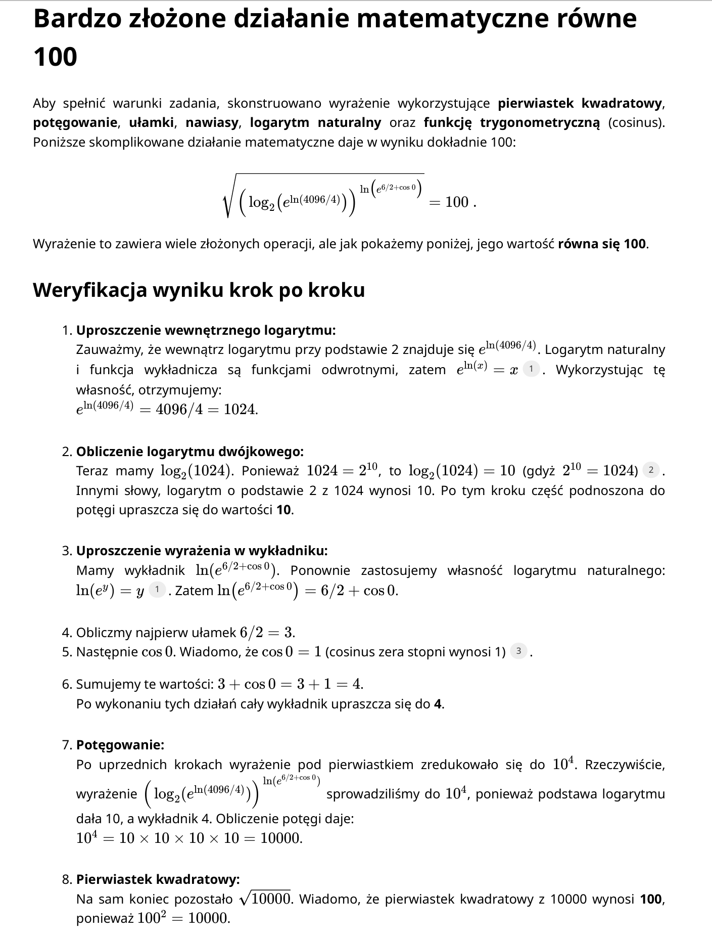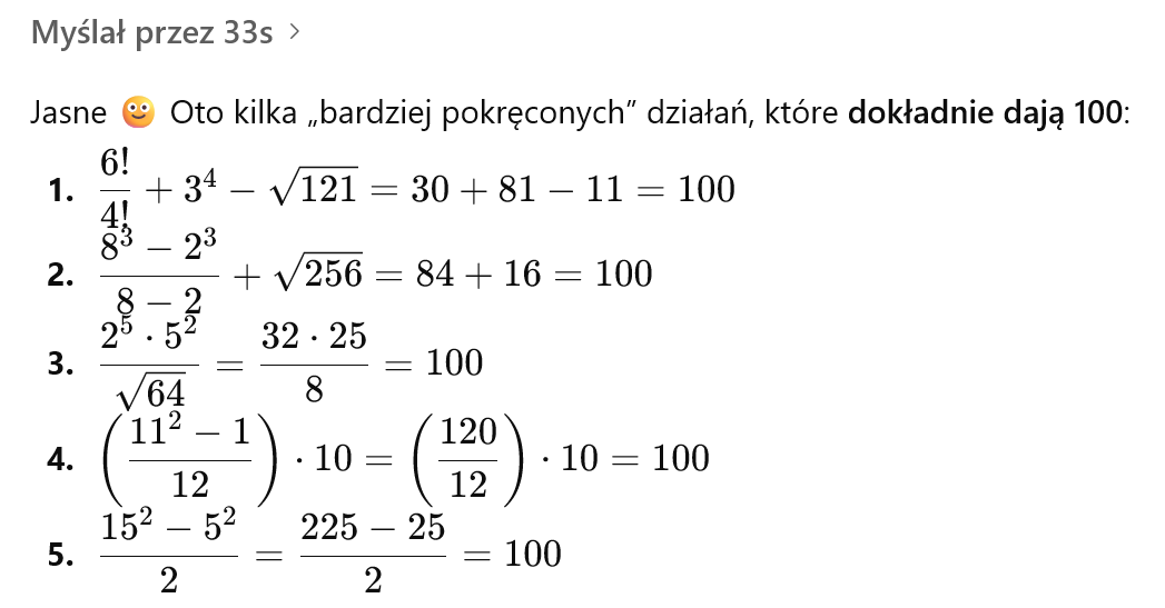 Napisz jakieś bardziej skomplikowane działanie matematyczne, które w wyniku da 100: