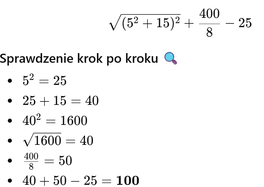 I patrzcie jaką dostałem odpowiedź. Na początku czytając to myślałem, że czegoś nie zauważyłem i odpowiedź 80 jest nieprawidłowa, bo AI twierdzi, że 80 jest źle, ale na końcu podaje wynik 80 po bezsensownych obliczeniach.