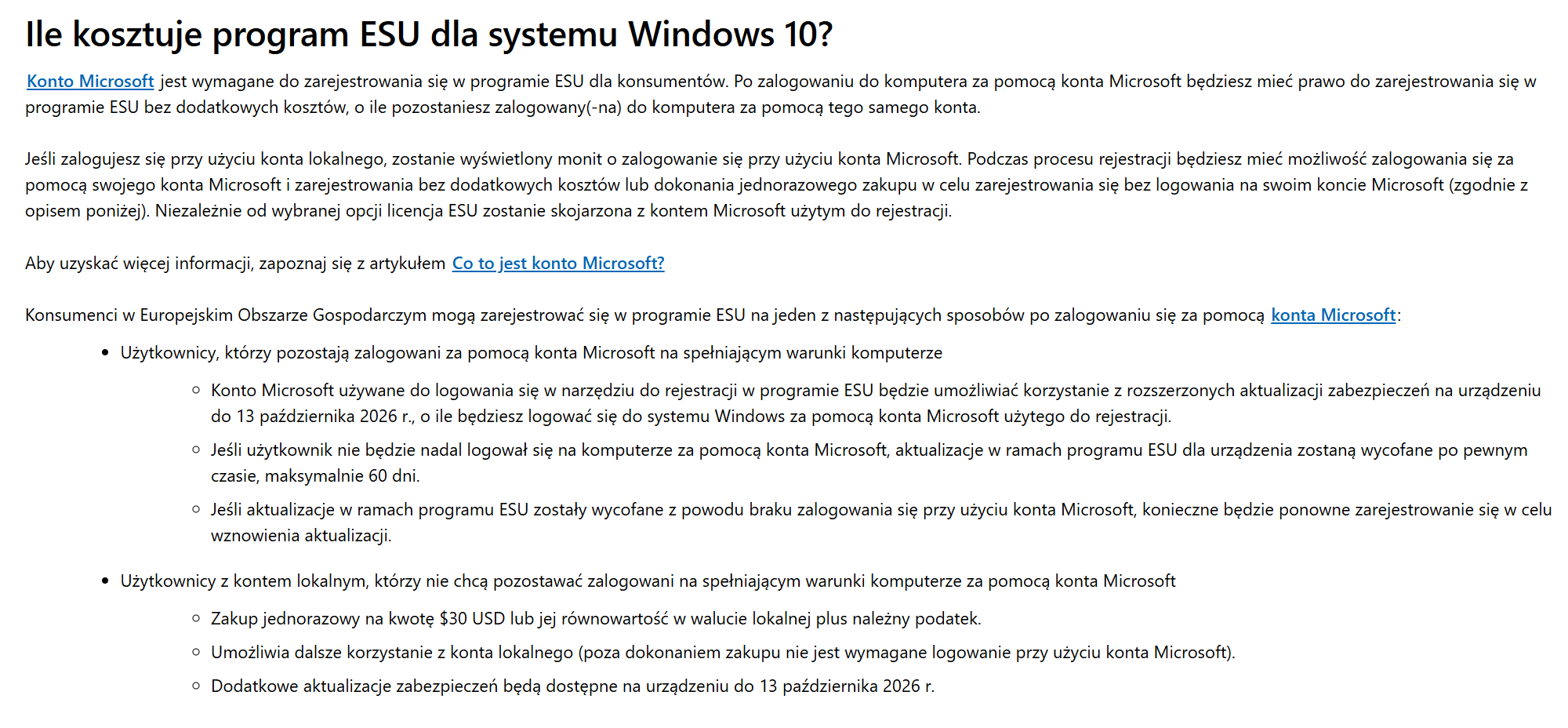 Microsoft pod naciskiem organizacji konsumenckiej zrezygnował także z wymogu synchronizowania ustawień maszyny z kontem Microsoft – wystarczy rejestracja w programie ESU i uwierzytelnianie za pomocą konta Microsoft co 60 dni.