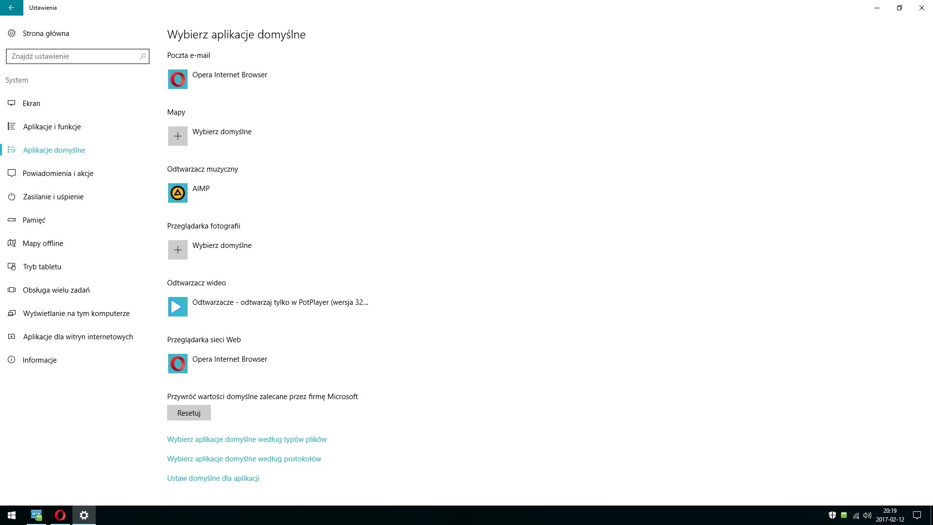 Kliknij -Ustaw domyślne dla aplikacji i zobacz czy masz te programy w spisie.