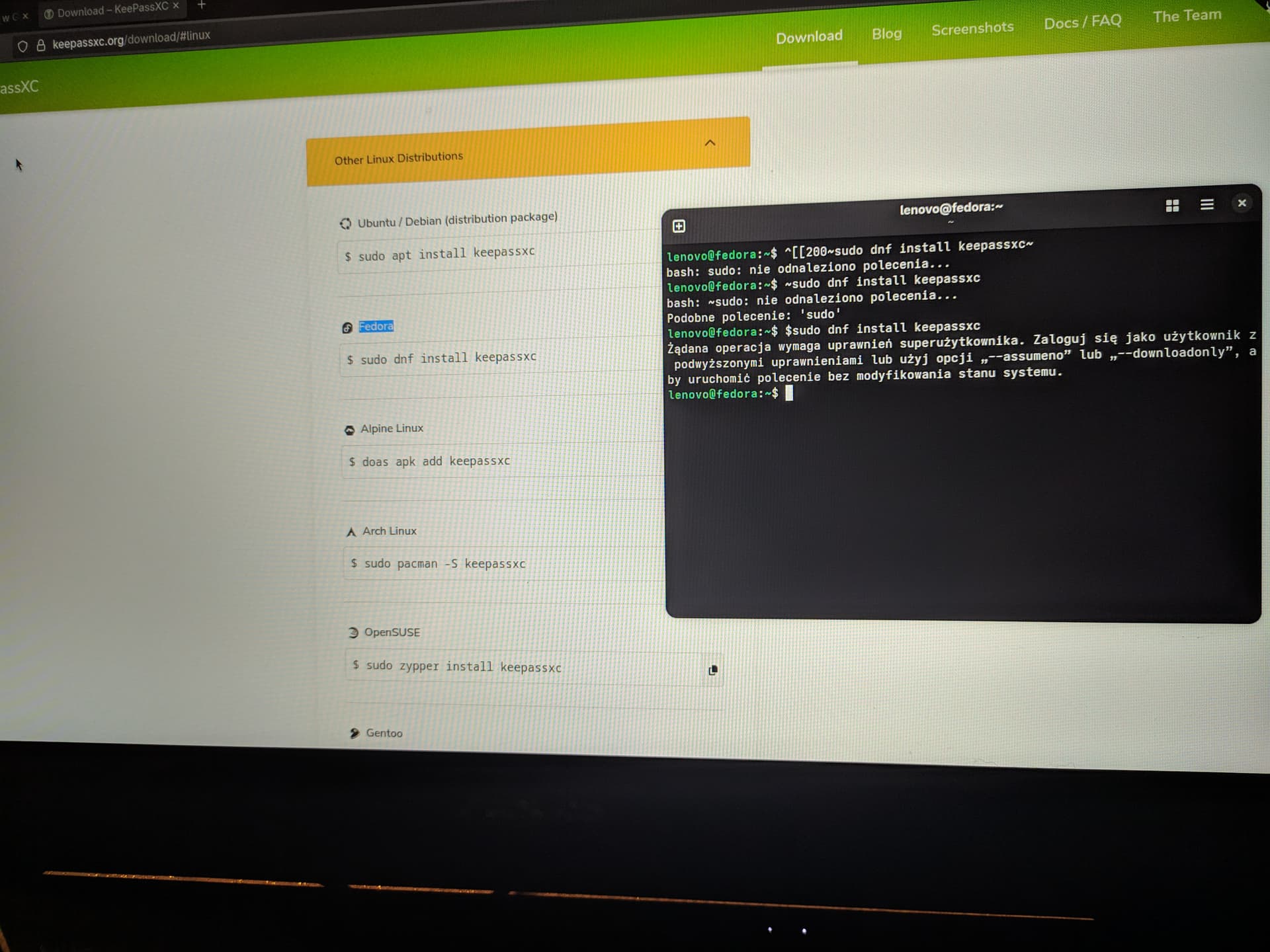 Zainstalowałem fedorę na próbę i chciałem zainstalować KeepassXC (zaznaczam że jestem laikiem i dopiero zaczynam przygodę z tym systemem). Robiłem to przez terminal wg instrukcji na stronie niestety jak widać na zrzucie nie udało się. Jak zainstalować KeepassXC, co robię źle.