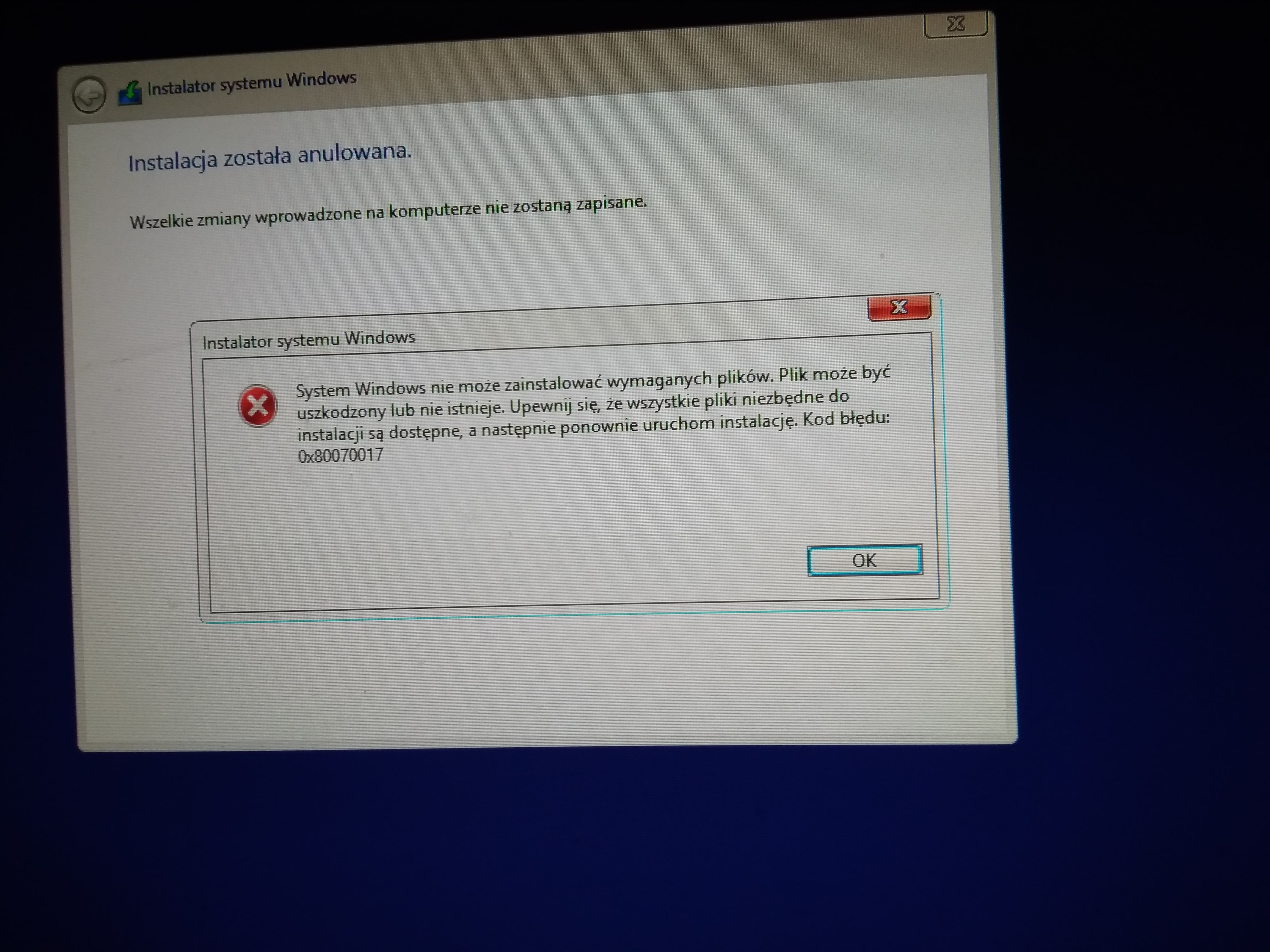 Przedewszystkim upewnij się, że nośnik instalacyjny jest sprawny. Najlepszym rozwiązaniem będzie instalacja z USB. Następnie upewnij się, że dysk twardy, na którym instalujesz system operacyjny, nie ma żadnych błędów.
