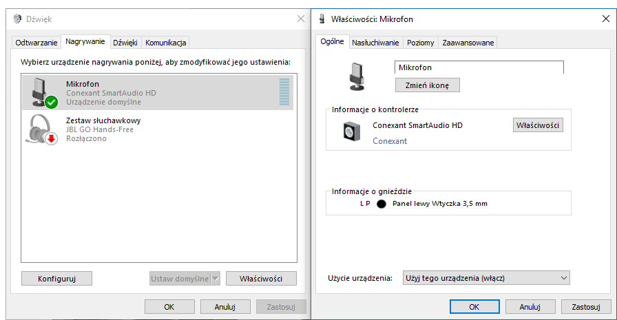 Cześć, ostatnio usunąłem ze słuchawek mikrofon (złamany kabel i wyrzuciłem te małą konsolke z przyciskami) i teraz gdy podłączam słuchawki to dźwięk naturalnie leci na sluchawkach, a jak zrobić żeby dźwięk lecial na słuchawkach a mikrofon działał z laptopa ? Dorzucam screena z urządzeń do nagrywania.