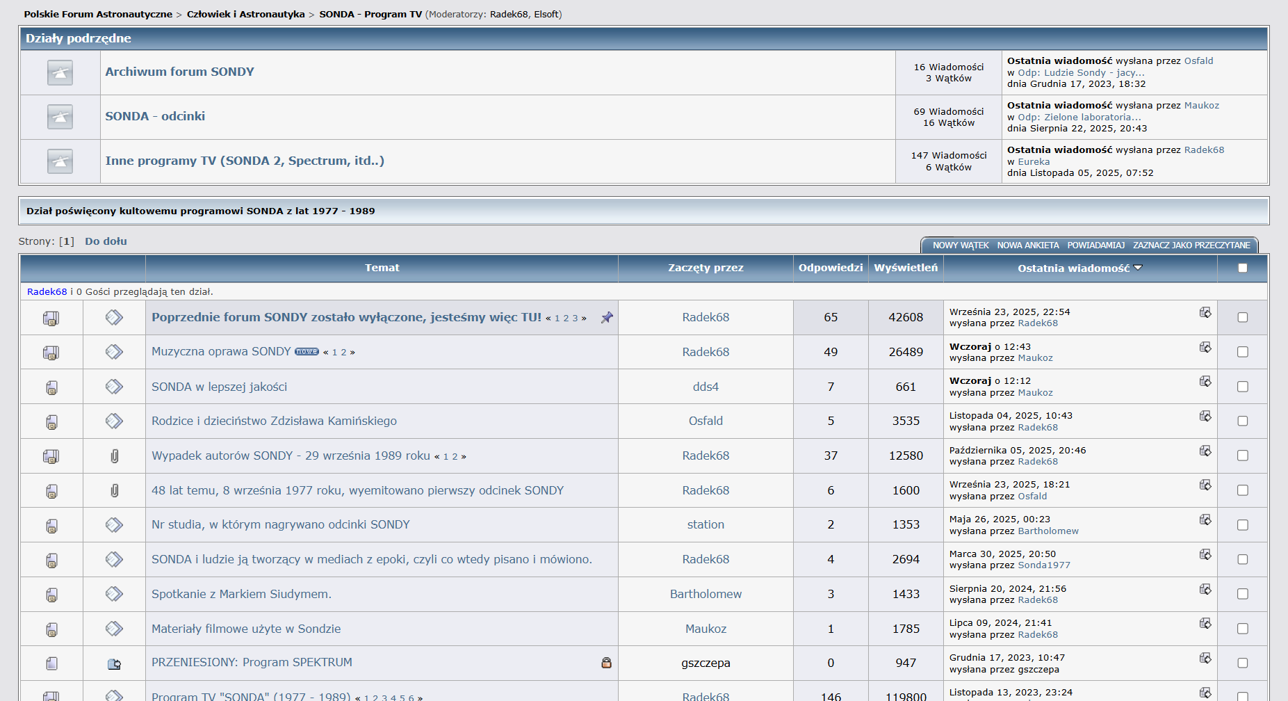 Dlatego, w porozumieniu z administratorami forum.kosmonauta.net, założyliśmy tam dział dotyczący SONDY (link bezpośredni: SONDA - Program TV) i pewne osoby z poprzedniego forum tam przeszły. Ja jestem tam moderatorem globalnym. Ale aktywność już była nie ta. A teraz jest jeszcze mniejsza, choć to akurat może wynikać z braku aktualnych tematów.