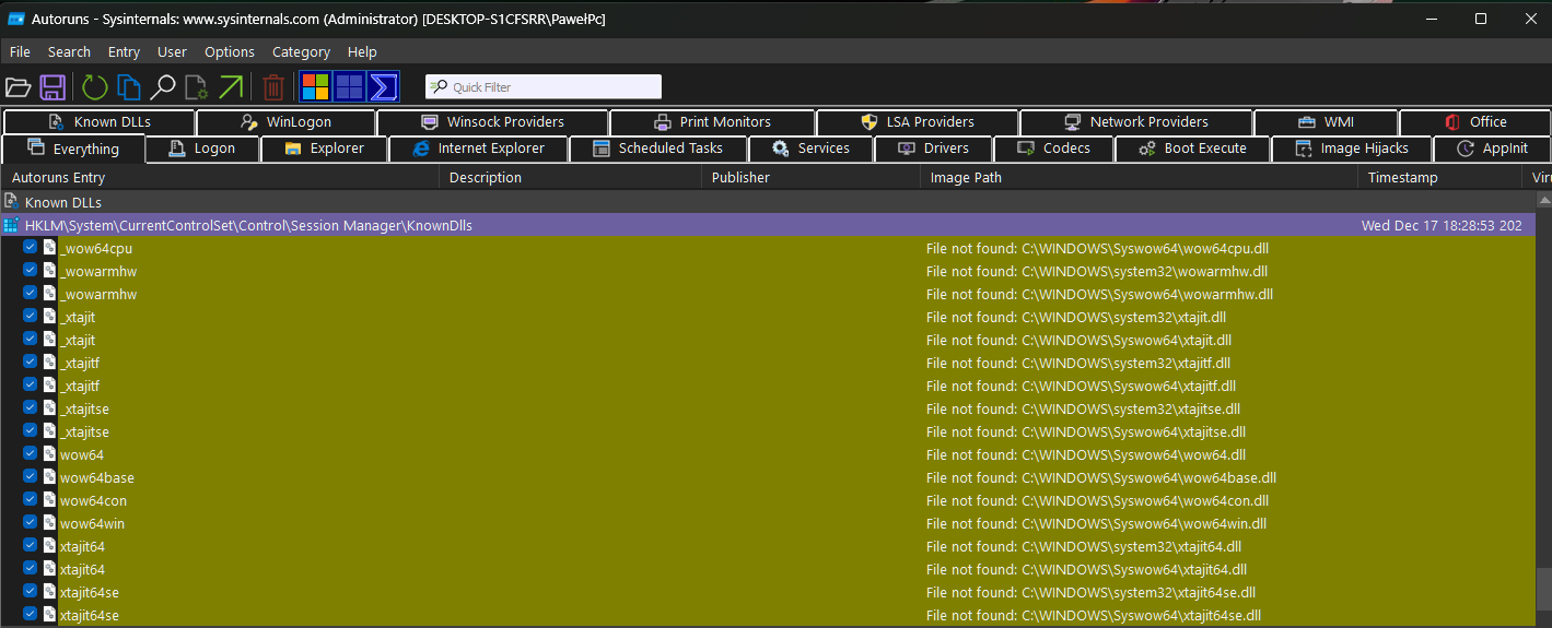 Ponadto brakuje jeszcze (czego nie dodałem na screenshocie) „\Microsoft\Windows\UpdateOrchestrator\USO_UxBroker To zadanie wyzwala ponowne uruchomienie systemu po zainstalowaniu aktualizacji. File not found: C:\WINDOWS\system32\MusNotification.exe” oraz „Adobe Type Manager File not found: atmfd.dll”