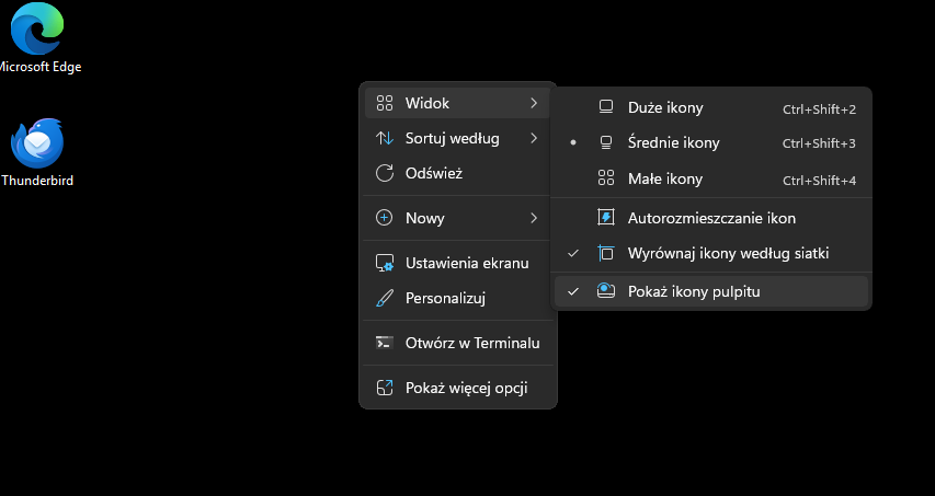 Oczywiście, że „Pokaż ikony Pulpitu” nie jest aktywne. OperaSetup.exe oraz Nowy folder to nie są ikony i nie Pulpitu. To plik i folder. Dokładnie tak samo mam w poprzedniej wersji Windows 24H2, bodajże. Dzięki temu nie widać ikony Kosza (to jest ikona Pulpitu) oraz „Dowiedz się więcej o tym zdjęciu”, ale pliki czy foldery są widoczne normalnie.