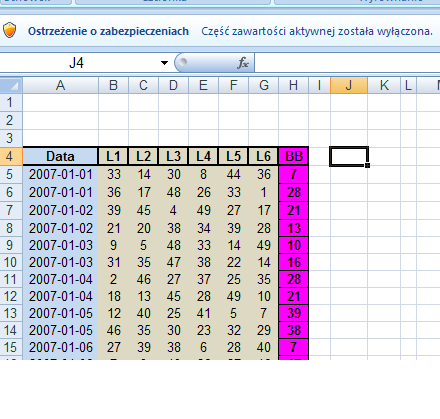 Oczywiście formułę chcę przeciągnąć i sprawdzić nią np. ile podanych przeze mnie trójek wypadło przez XXXX losowań.