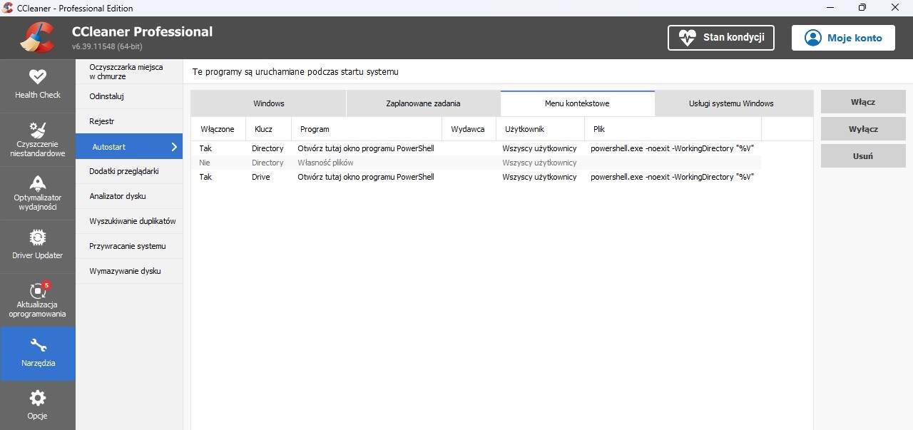 . W programie CCleaner > Narzędzia równiez nie ma Menu Kontekstowe’go, jest owszem ale w lokalizacji Narzędzia > Autostart > Menu Kontekstowe…