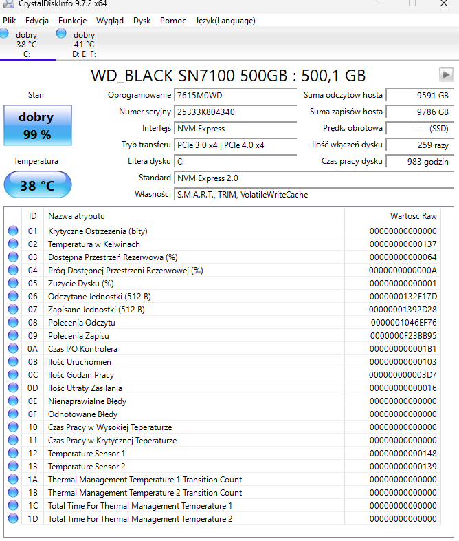 Program CrystalDiskInfo pokaże SMART i ogólną kondycję dysku: