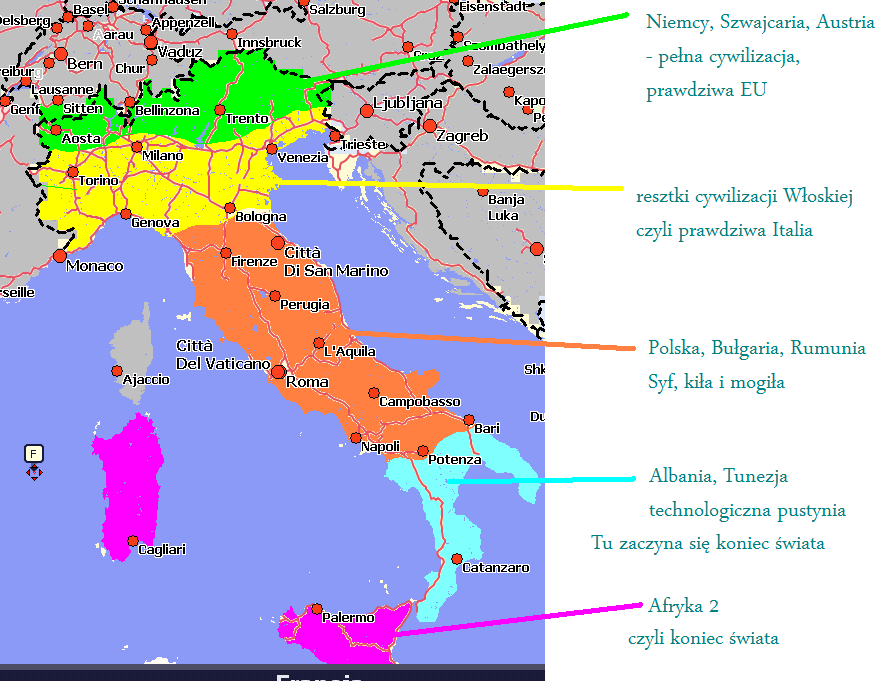 No i wspominam też o tym dlatego że Bułgar, Rumun, Litwin i Polak to najczęściej kontrolowana tam persona. Prawdziwa masakra ale nie dziwię się. Golf III, tablice SK, 5 młodych gniewnych z których 4 najaranych i 4 narąbanych. Taka Polska wizytówka… he he i jadą do pracy na południe Włoch gdzie obecnie bezrobocie tak od połowy półwyspu w dół wynosi >50%