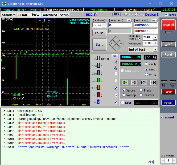 Zrobiłem skanowanie programem Victoria i wykazał błędy w początkowych sektorach dysku. nie skanowałem całości: