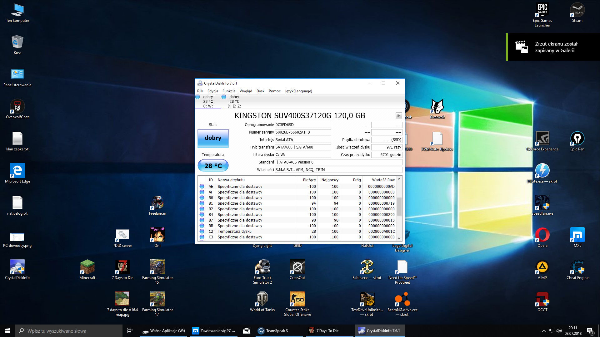 Mam możliwość niekorzystania z dysku ST, WIN 10 mam od 2 lat, a Search, superfetch i plik stronicowania to sprawdzę, ale dopiero po 17(praca). A tak na marginesie, wczoraj grając z kolegą w 7 days to die to tylko na początku 2 razy mi sie PC zatrzymał, w tym czasie dźwięk działał i mogłem rozmawiać z kolegą przez teamspeak’a bez żadnych problemów, hostowałem grę a on mógł normalnie grac, po 1 minucie wrócił do normalności a potem przez 3 godziny spokój, pc najczęściej (z dotychczasowej obserwacji) zawiesza sie całkowicie tylko w World od tanks, niezależnie na którym dysku go miałem i czy był stary czy też na nowo instalowany, w innych bardziej wymagających grach ten problem nie występuje, lub tylko na parę sekund (dying light, farming simulator 17, minecraft).