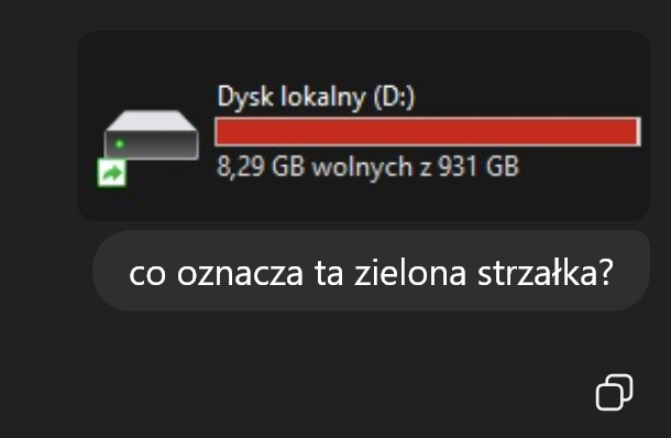 Zielona strzałka w prawo na ikonie dysku to znacznik udostępnienia. Nie oznacza ona skrótu, dysku offline ani specjalnego typu napędu, lecz sygnalizuje, że ten dysk został udostępniony w sieci lokalne